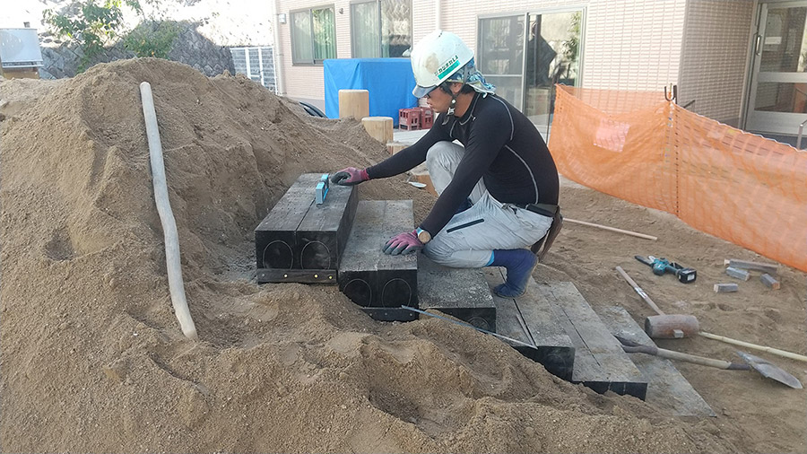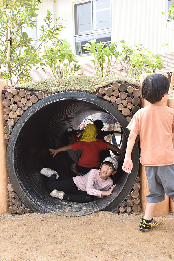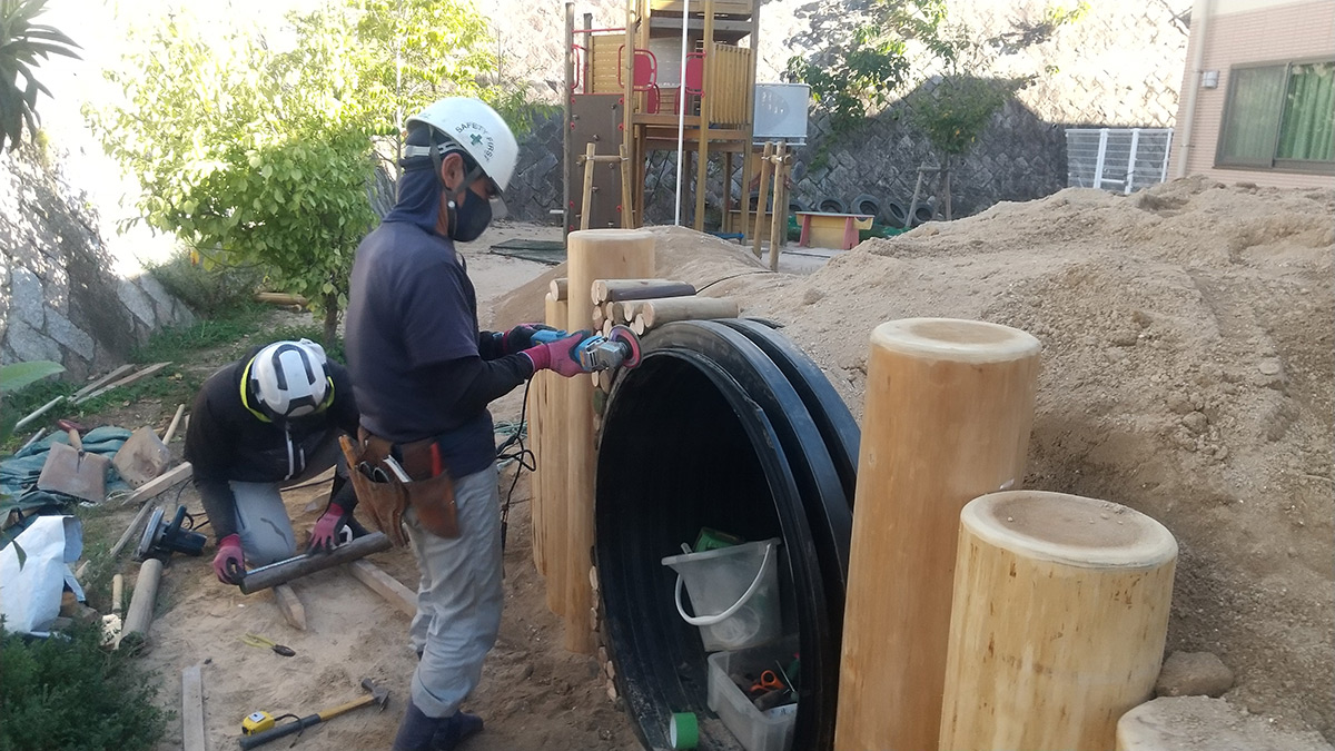 少し高い築山にトンネルを設置する場合、トンネル周辺の土を留める必要があり、補強材によりしっかりと固定した丸太や植栽により土の流亡対策を行い築山としての機能を維持できるように施工。丸太の角部やトンネル端部を削り加工することで、園児が安心して利用できるように処理しています。