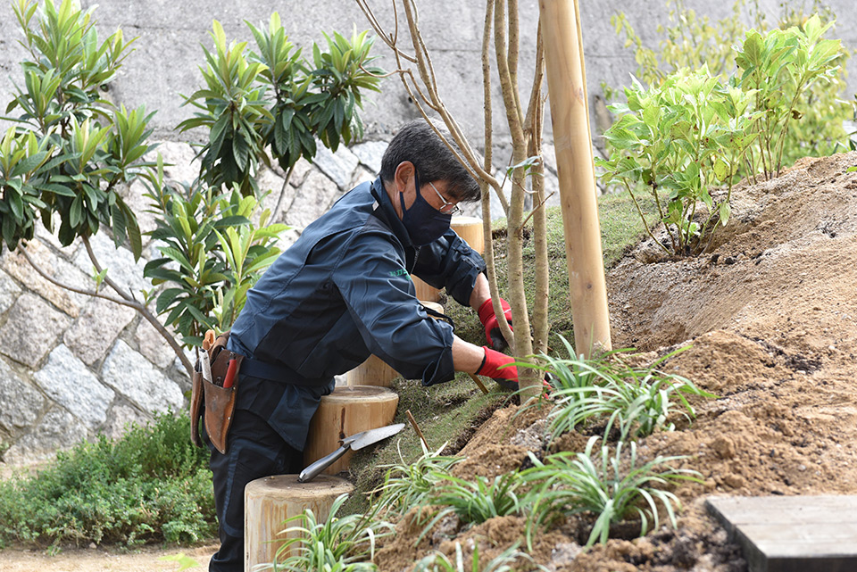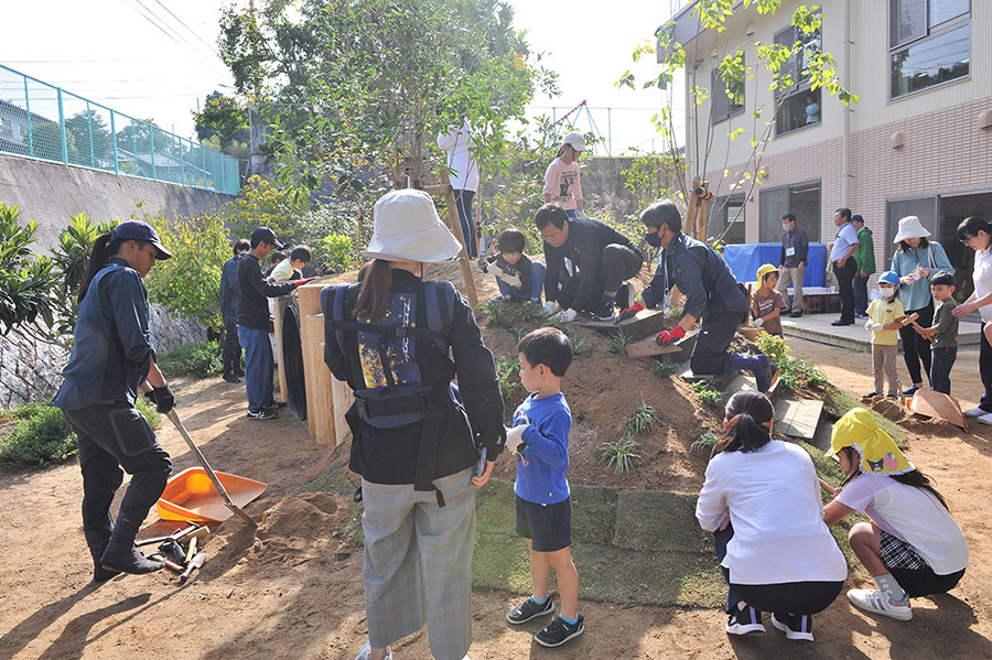 まず現地を調査し、園児たちが無理なく遊べるスペースを確保した改修イメージ図を提案。記念事業であることから、構造物および土工は当社が担当し、植栽および芝張りは園児・保護者・先生、計45名による協働作業(記念植樹)で実施しました。