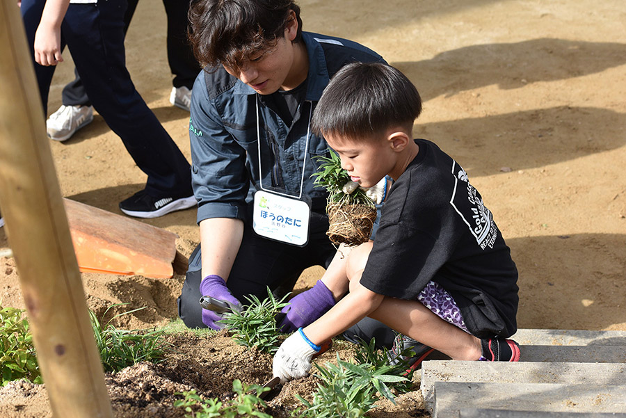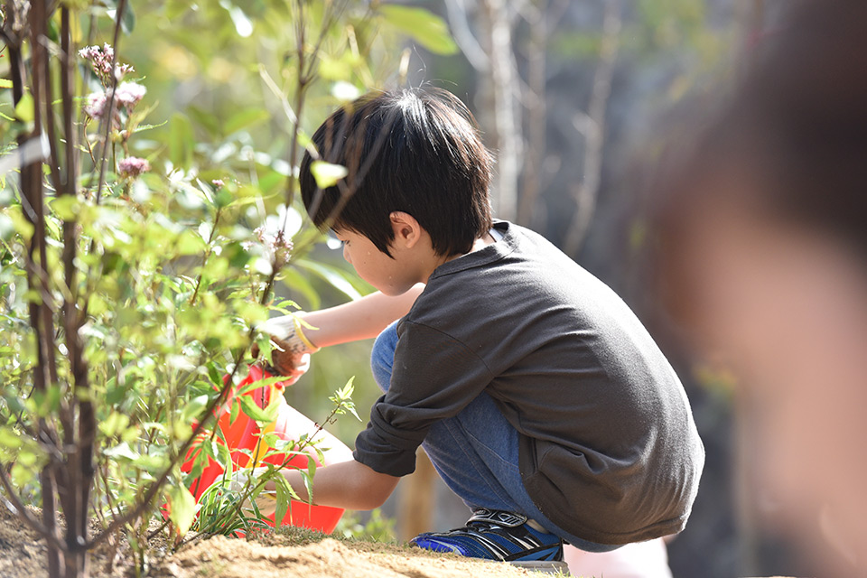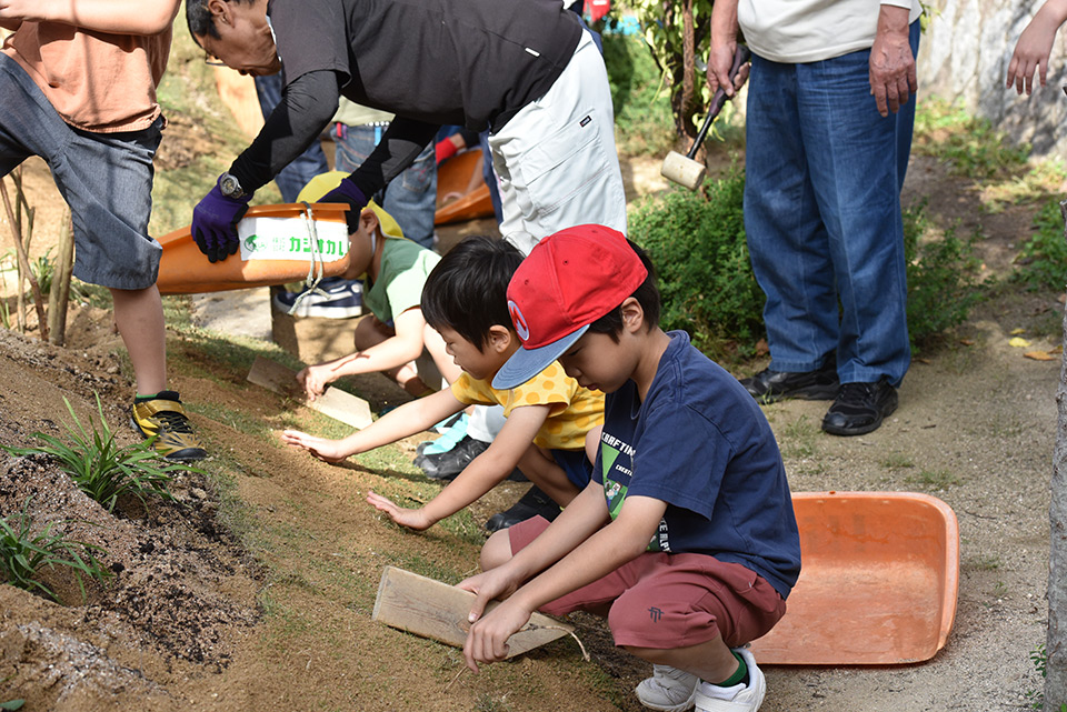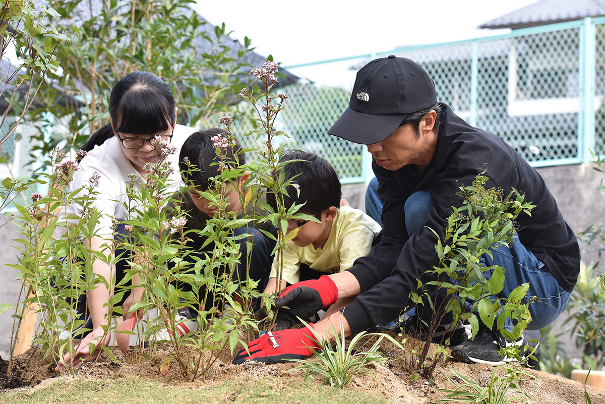 ベースとなる園庭改修工事の完成を記念し、低木・下草の植え付けおよび芝張りを協働作業として実施。参加者は年長組の園児と保護者約40名、先生5名、計45名と当社社員5名が作業サポートに付きました。 最初にサポートスタッフから作業内容の説明と指導を行い、その後親子で作業を進めてもらいました。最初は不慣れな手つきでしたが、次第にコツをつかみ、最後はプロ顔負けのスピードで作業完了。 笑顔で植えた植物に「大きく、早く育ってね」と水をやる姿が微笑ましい限りでした。