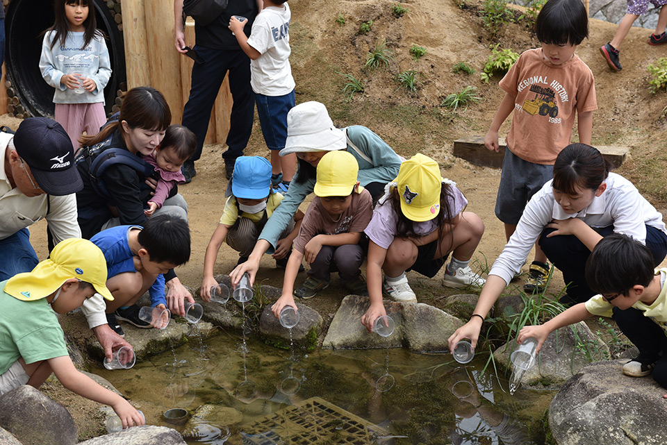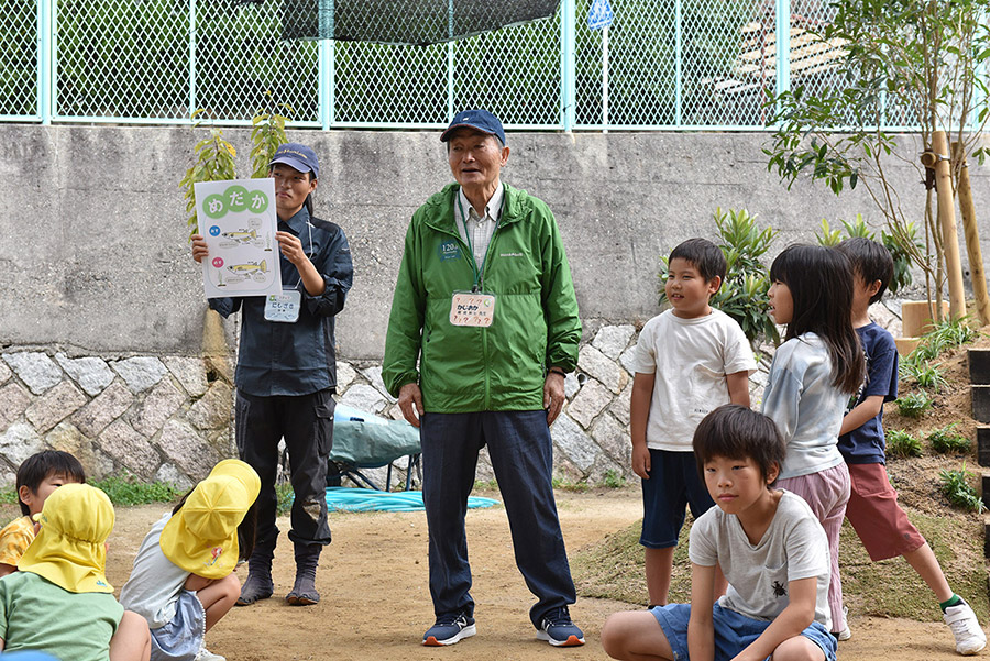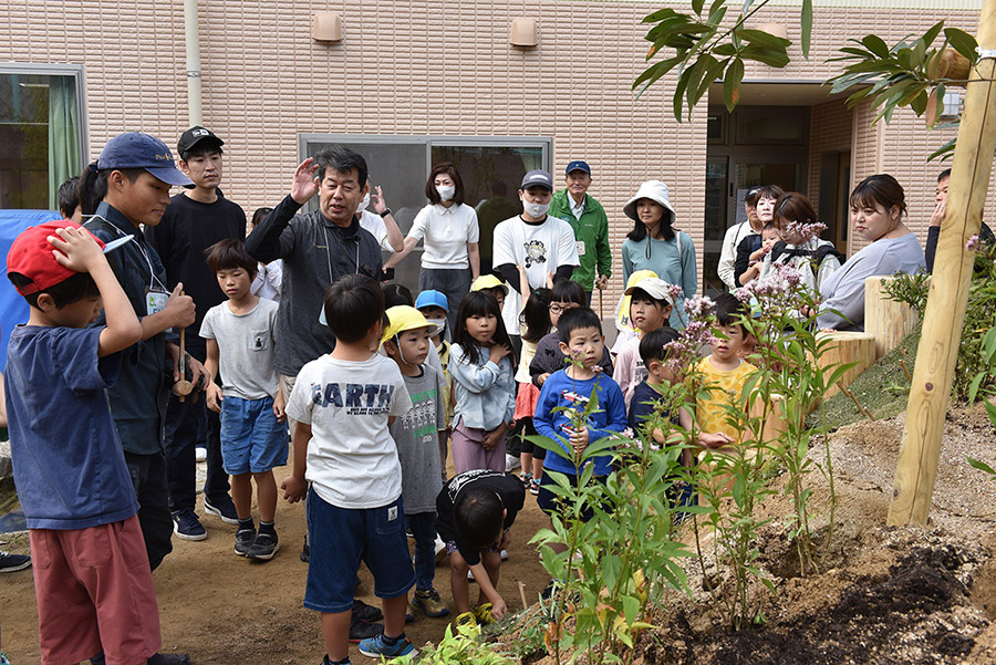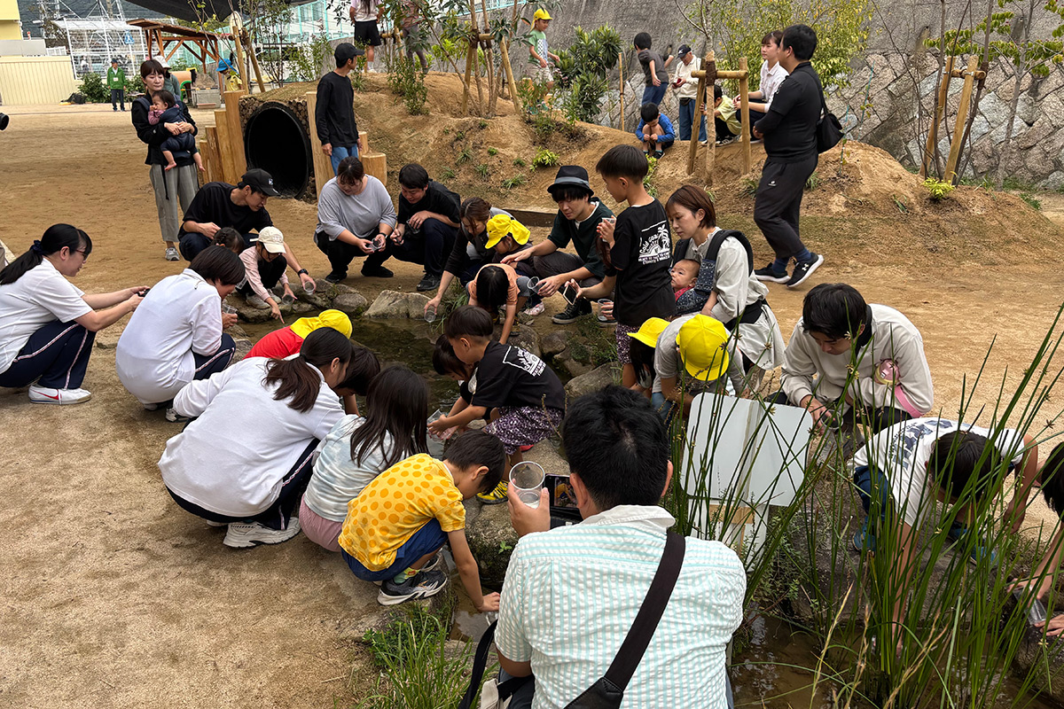 協働作業終了後、春と秋に観察会を行っている既存のひょうたん池にて、メダカの放流を行いました。放流前には、メダカの生態や特徴について簡単な説明とクイズを行いメダカについて理解を深めてもらいました。その後、親子ペアおよび先生方で「メダカさん、大きく育ってね」と声をかけながら一斉に放流。子どもたちは自分の放したメダカの行方を目で追い、自然とのつながりを実感している様子でした。引き続き子供たちの自然観察のサポートを行っていきます。