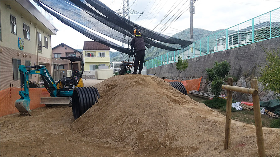 令和7年1月、ビオトープの池や観察会などで日頃から関わりのあった「すいこう認定こども園」より、創立50周年記念事業として、子どもたちの「創造あふれる遊び」をテーマとした園庭の改修工事の依頼を受けました。ポイントは2点、自然の変化や生き物の営みにふれて感嘆する心「センス・オブ・ワンダー」を育むことと、トンネル付きの築山で体を動かせる「冒険の園庭」を作ることでした。