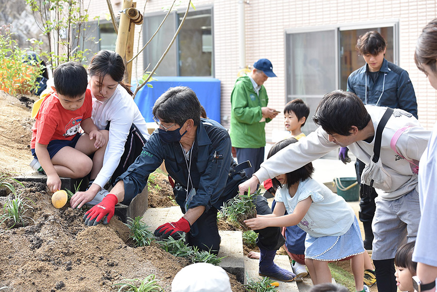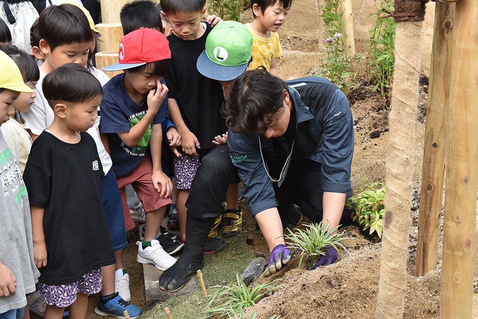 ベースとなる園庭改修工事の完成を記念し、低木・下草の植え付けおよび芝張りを協働作業として実施。参加者は年長組の園児と保護者約40名、先生5名、計45名と当社社員5名が作業サポートに付きました。 最初にサポートスタッフから作業内容の説明と指導を行い、その後親子で作業を進めてもらいました。最初は不慣れな手つきでしたが、次第にコツをつかみ、最後はプロ顔負けのスピードで作業完了。 笑顔で植えた植物に「大きく、早く育ってね」と水をやる姿が微笑ましい限りでした。