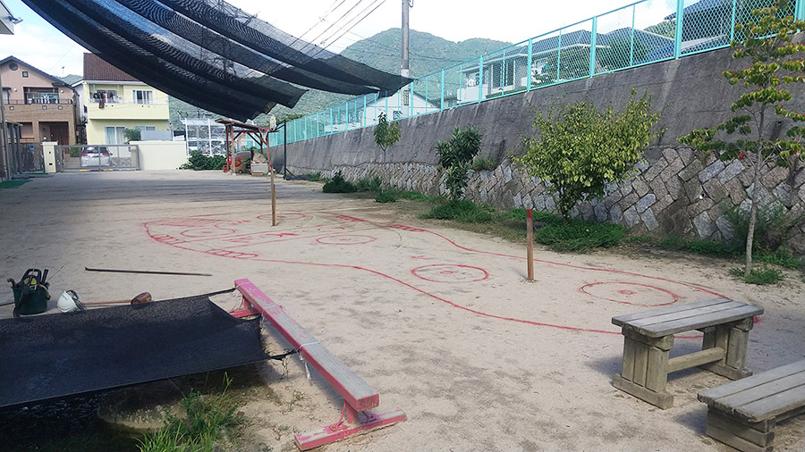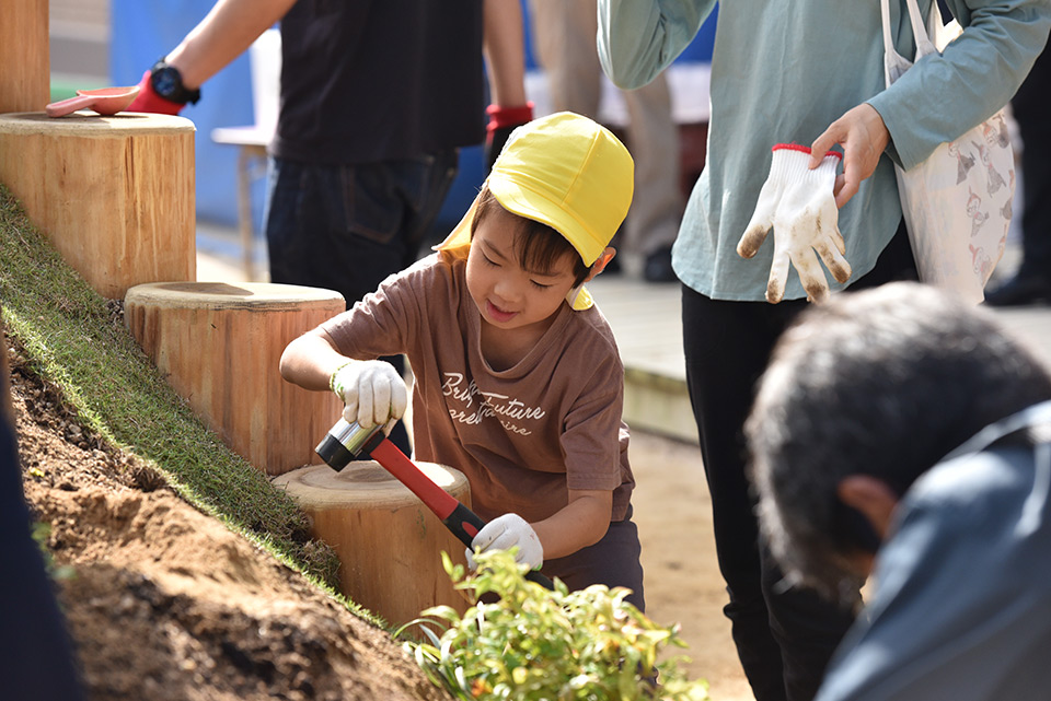 まず現地を調査し、園児たちが無理なく遊べるスペースを確保した改修イメージ図を提案。記念事業であることから、構造物および土工は当社が担当し、植栽および芝張りは園児・保護者・先生、計45名による協働作業(記念植樹)で実施しました。