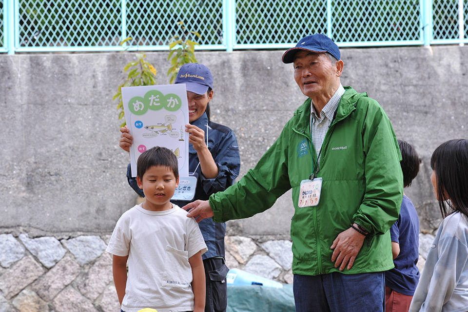 協働作業終了後、春と秋に観察会を行っている既存のひょうたん池にて、メダカの放流を行いました。放流前には、メダカの生態や特徴について簡単な説明とクイズを行いメダカについて理解を深めてもらいました。その後、親子ペアおよび先生方で「メダカさん、大きく育ってね」と声をかけながら一斉に放流。子どもたちは自分の放したメダカの行方を目で追い、自然とのつながりを実感している様子でした。引き続き子供たちの自然観察のサポートを行っていきます。