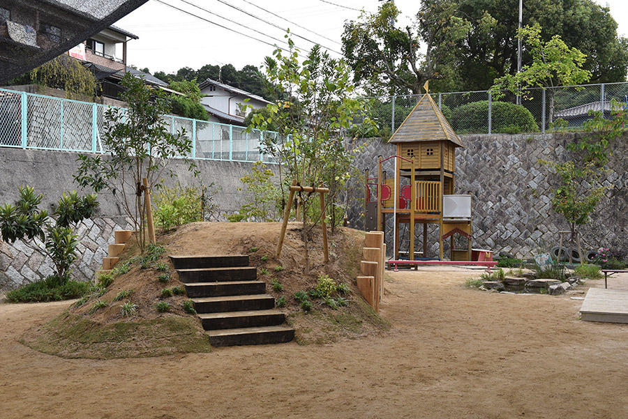 少し高い築山にトンネルを設置する場合、トンネル周辺の土を留める必要があり、補強材によりしっかりと固定した丸太や植栽により土の流亡対策を行い築山としての機能を維持できるように施工。丸太の角部やトンネル端部を削り加工することで、園児が安心して利用できるように処理しています。